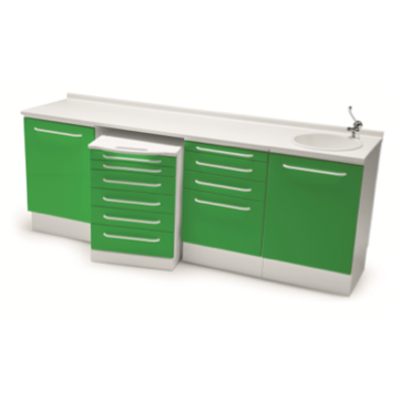 Комплект мебели Winn Pad 2080х500хH865/905 мм. С единой ламинированной столешницей с интегрированным плинтусом в составе: WY101 тумба с открывающейся дверцей и встраиваемыми стеклянными полками. WS020 ниша для подкатного модуля. WY306 подкатной модуль с 6 выдвижными ящиками 2х60,3х120, 1х180 мм. WY104 тумба с 4 выдвижными ящиками: 1х60,2х120,1х360 мм. WY124 тумба с мойкой из нержавеющей стали, смеситель и корзина для мусора.